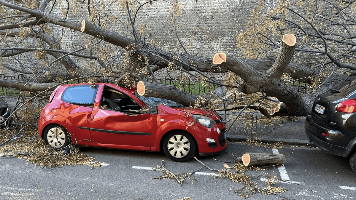 Voiture écrasée par un arbre à Perpignan au passage de la tempête Nils ce jeudi 12 février 2026 - photo Arpy Cod