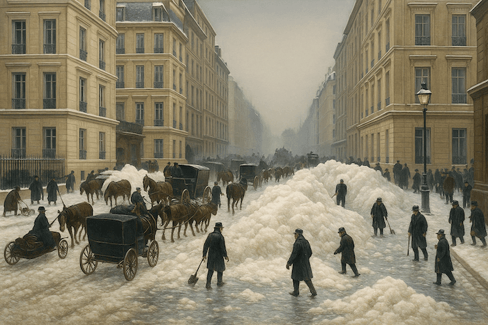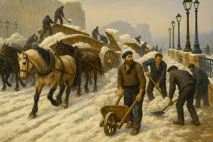 L’extraordinaire quantité de neige entraîne divers problèmes en ville. À Paris, d’immenses chariots sont installés sur les places pour recevoir les amas de neige que l’on déverse ensuite dans la Seine. Mais comme le fleuve est pris par les glaces, de véritables montagnes de neige se forment au niveau des ponts, en particulier près du pont Saint-Michel. Au bout de quelques jours, ces monticules deviennent si hauts qu’ils atteignent presque le tablier des ponts ! Malgré les 4 000 tombereaux mobilisés, l’efficacité n’est pas au rendez-vous, et le service des ponts et chaussées expérimente une nouvelle machine tractée par huit chevaux. Pendant ce temps, les Parisiens s’inquiètent : les ordures s’accumulent, et l’on commence à redouter l’apparition d’épidémies.
