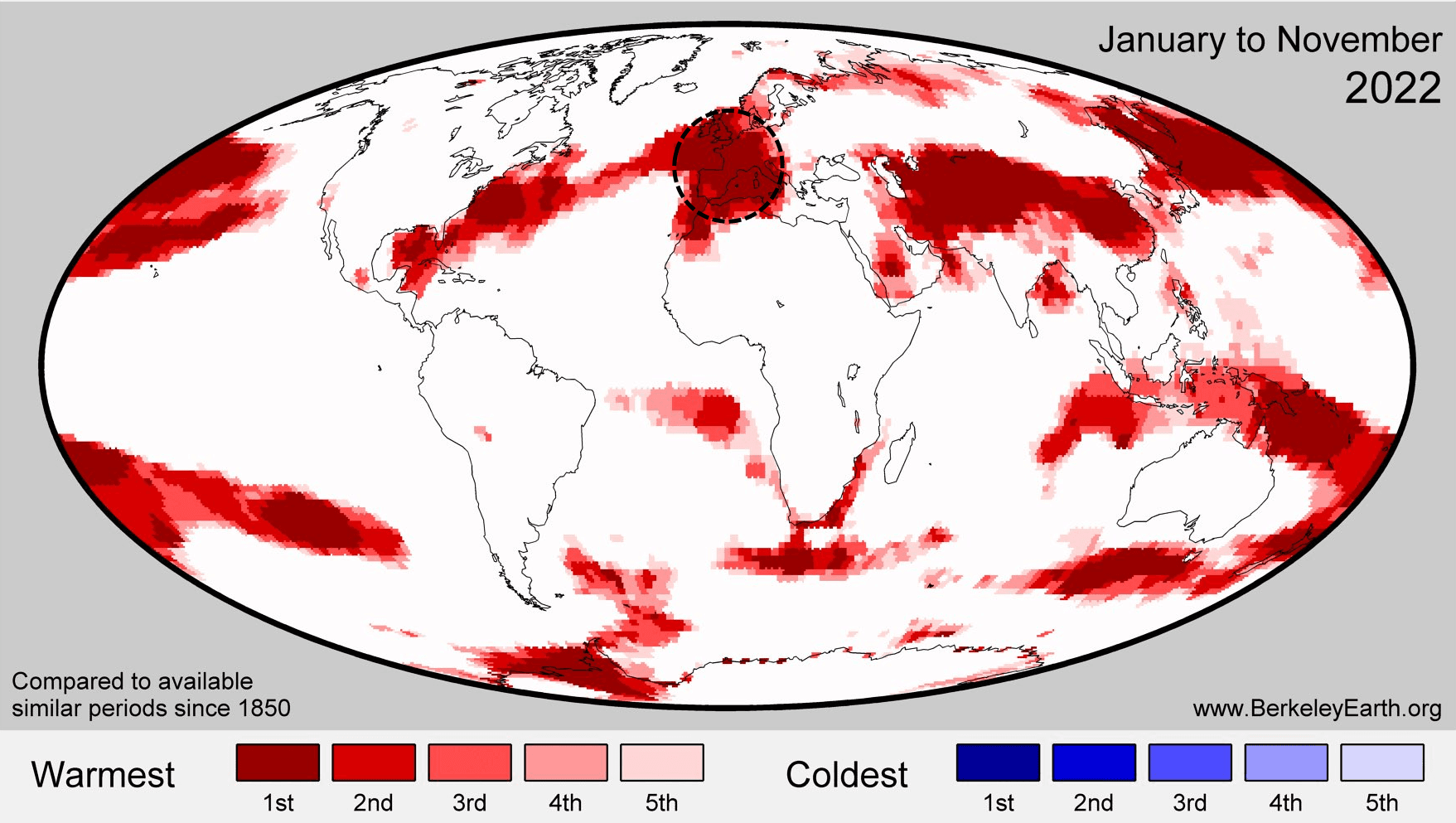 Zones ayant enregistré une année 2022 exceptionnellement chaude – via BerkeleyEarth.org