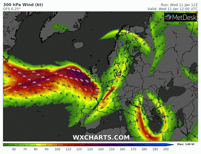 Courant jet du 11 et le 20 janvier 2023, montrant un temps agité sur l'Europe de l'Ouest - via wxcharts.com