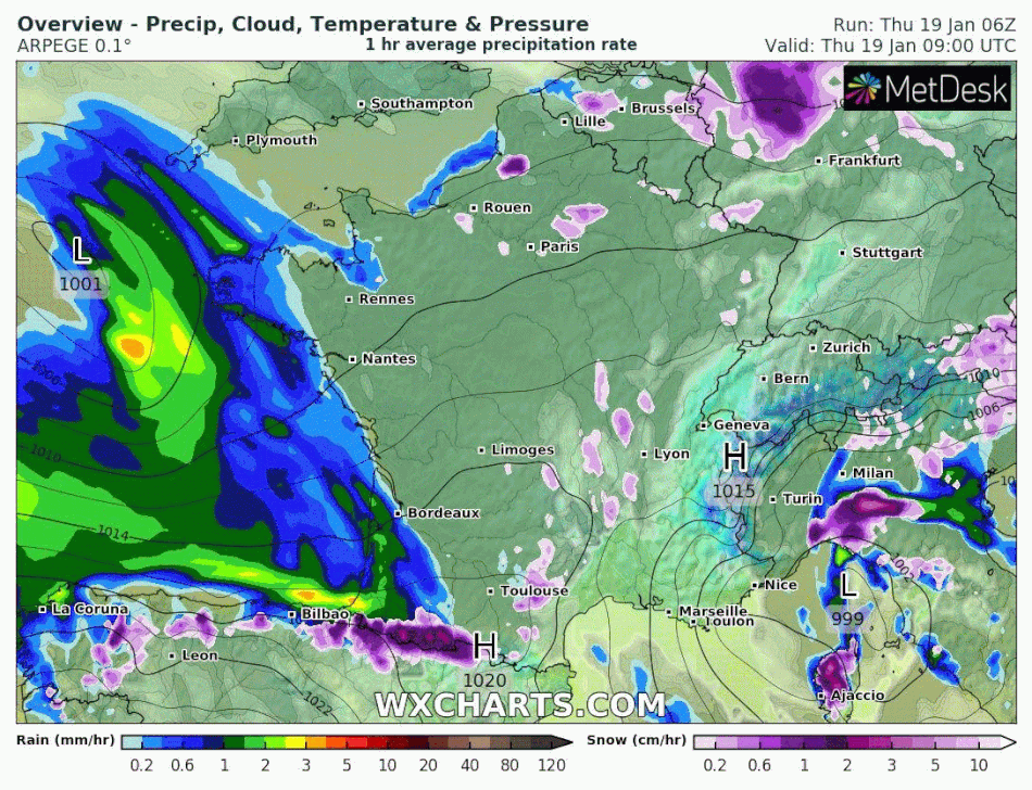 Précipitations pour la journée du jeudi 19 janvier 2023 (neige en teintes violettes) – via wxcharts.com
