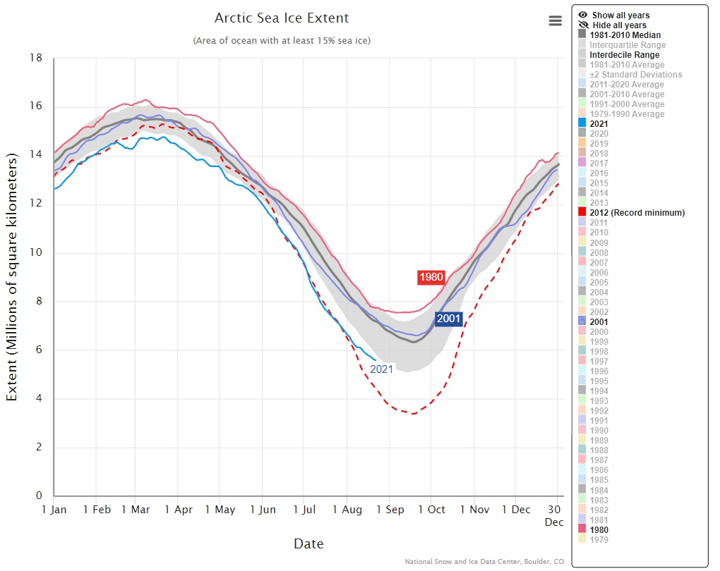 Cette valeur pourrait sembler encourageante par rapport aux années précédentes mais est à grandement relativiser. En effet, la moyenne du minimum annuel lors de la période 1981-2010 est située à 6,344 millions de km², soit plus d'un million de plus que durant cette année 2021.