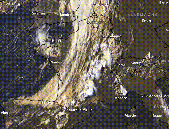Dès le milieu d'après-midi, les premiers signalements d'orages forts ont été enregistrés, puis l'axe orageux se déploie du Sud-Ouest au Nord-Est du pays, comme prévu. L'image satellite est un cas d'école de ce type de dégradation orageuse à l'avant d'un front froid.