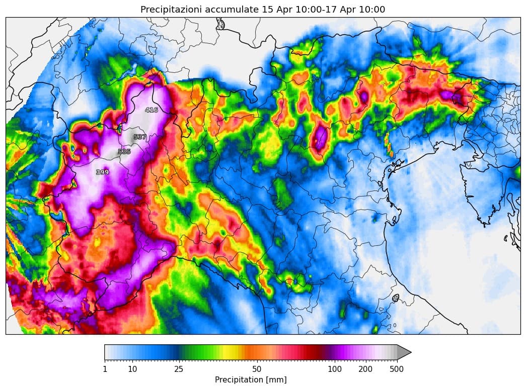 Accumulation de précipitations entre le 15 et le 17 avril à 10h – via Twitter @Italia24HLive