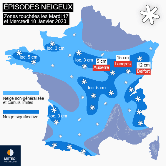 Les flocons de neige ont été observés dans de nombreuses régions bien que les chutes ne furent significatives que dans certains secteurs. En journée du mardi 17 janvier 2023, la neige est notamment tombée de l'Orléanais (parfois 3 cm) jusqu'aux Vosges. On a pu mesurer 5 cm à Auxerre dans l'Yonne, 12 cm à Belfort et même 15 cm à Langres en Haute-Marne. Les secteurs situés au nord du Massif Central ont aussi reçu des quantités parfois notables (parfois 3 à 5 cm). Par ailleurs, des giboulées de neige ont concerné la Normandie et la Bretagne mercredi 18 janvier 2023 avec parfois 3 à 5 cm sur les collines normandes et les hauteurs bretonnes. Enfin, de la neige par isothermie a touché la Gironde avec 1 cm sur Bordeaux et parfois 3 cm en dehors de l'agglomération.