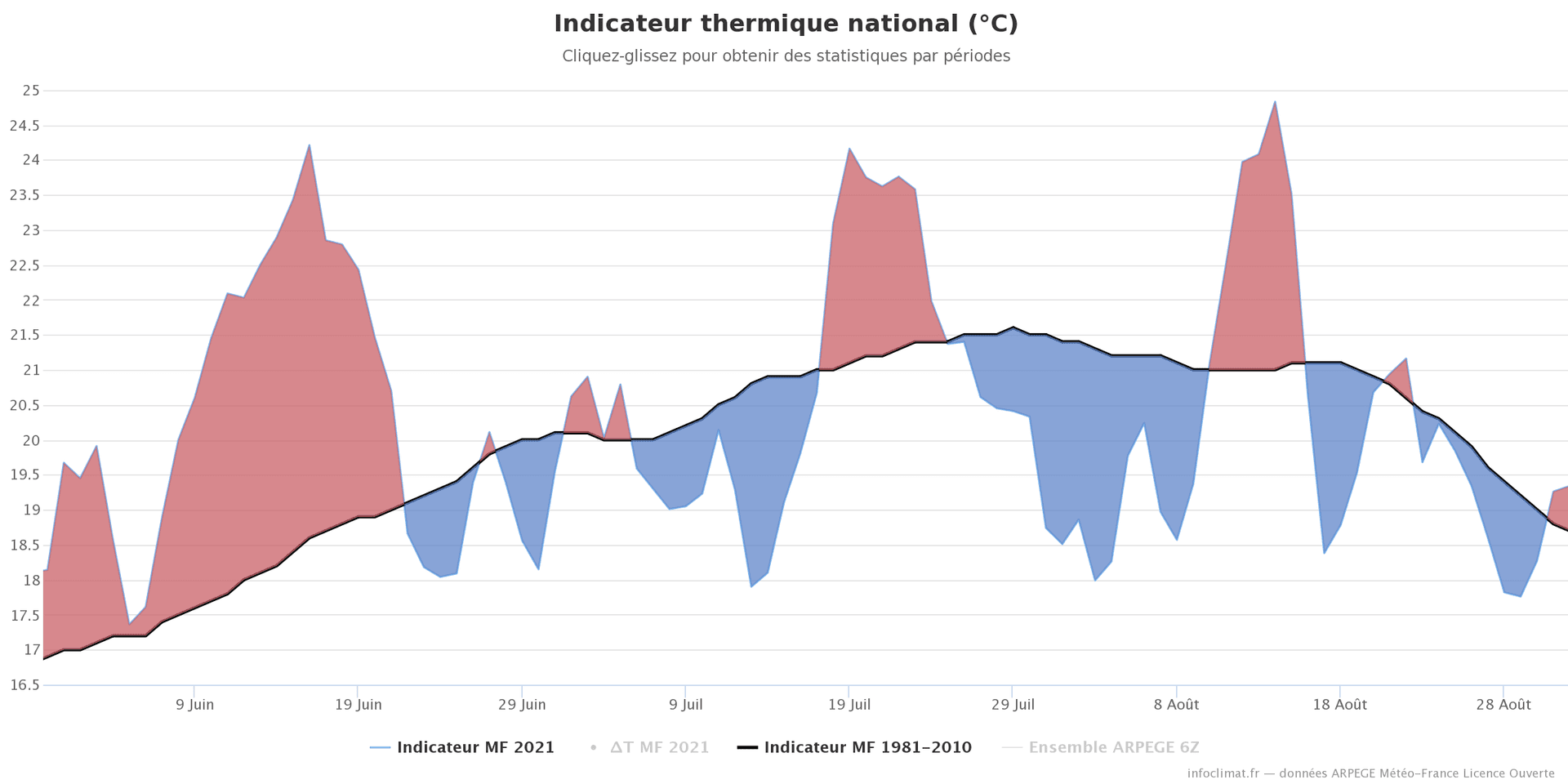 La bascule s'est effectuée à partir du 21-22 juin, coïncidant avec le début de l'été calendaire (dont les dates diffèrent avec l'été météorologique). Depuis cette date, les périodes fraîches ont bien été bien plus fréquentes (fin juin, première moitié de juillet et première moitié d'août) et les séquences chaudes ont été limitées et surtout bien courtes (mi-juillet et mi-août).