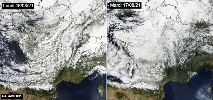 Images satellite des lundi 16 et mardi 17 août 2021 montrant des nuages bas envahissants sur l'Ouest et le Nord de la France - via NASA / MODIS