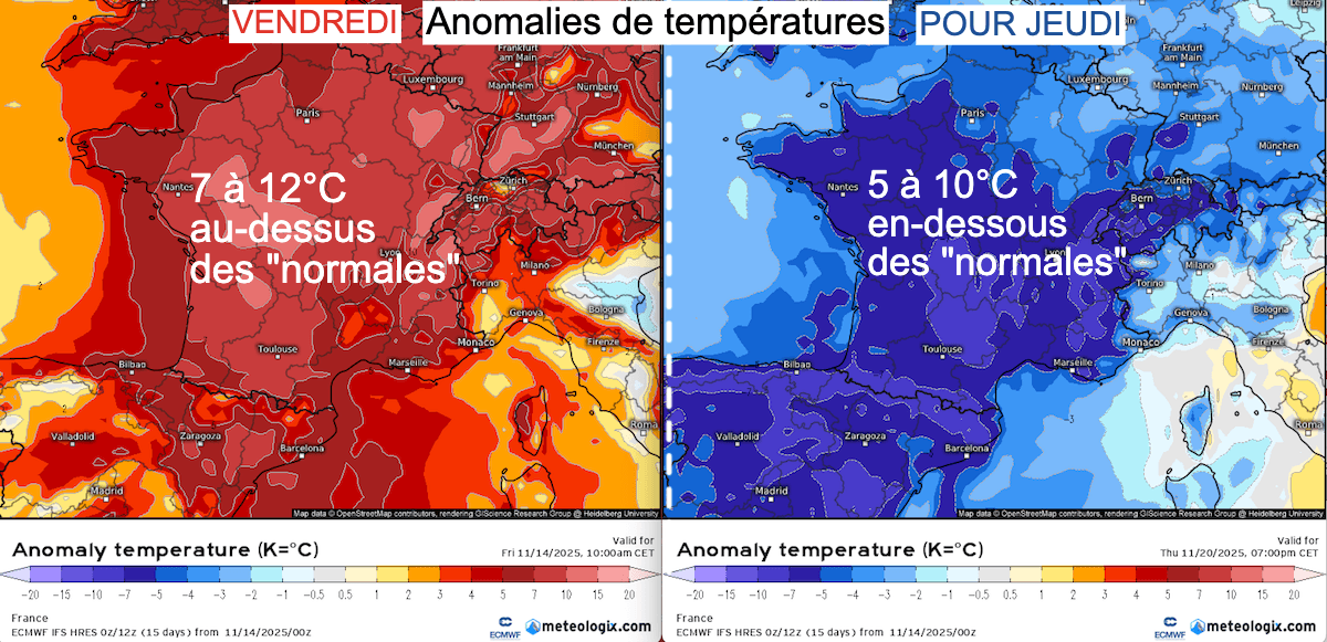 Évolution de la situation synoptique entre vendredi et jeudi avec les anomalies de température - modèle Météo européen