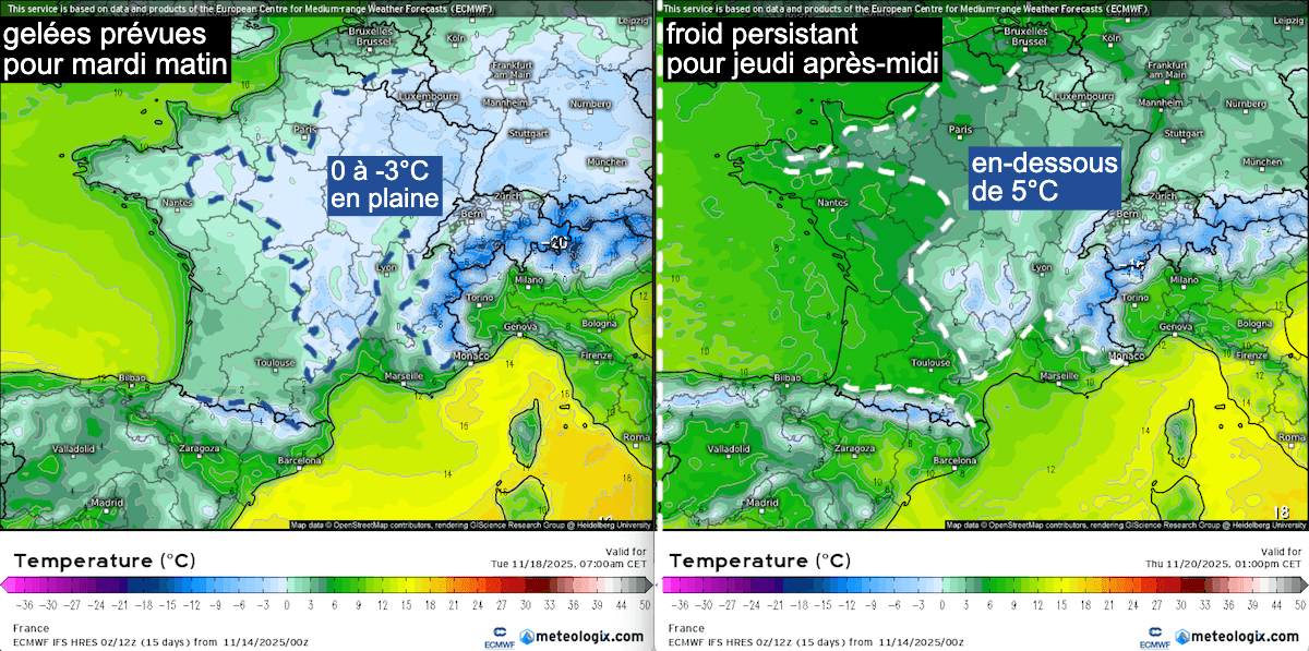 Températures minimales prévues mardi matin (à gauche) et températures maximales prévues jeudi après-midi (à droite) selon le modèle Météo européen.