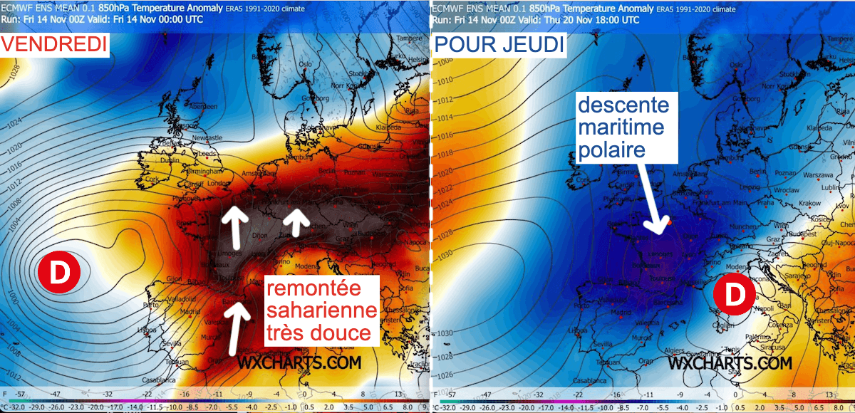 Le contraste avec le temps que nous connaissons actuellement risque d'être particulièrement marqué… Car d'un point de vue synoptique, ce sera caricatural ! En quelques jours, nous allons passer d'un puissant courant de sud d'origine saharienne (avec des records de douceur pour un mois de novembre), à une descente polaire maritime sur toute l'Europe du Nord et de l'Ouest. La bascule se fera en début de semaine prochaine, mais une baisse progressive des températures se produira dés ce week-end >>> lire notre bulletin météo réactualisé au quotidien ainsi que nos cartes de prévisions de l'état du ciel, du risque de précipitations et des températures maximales.