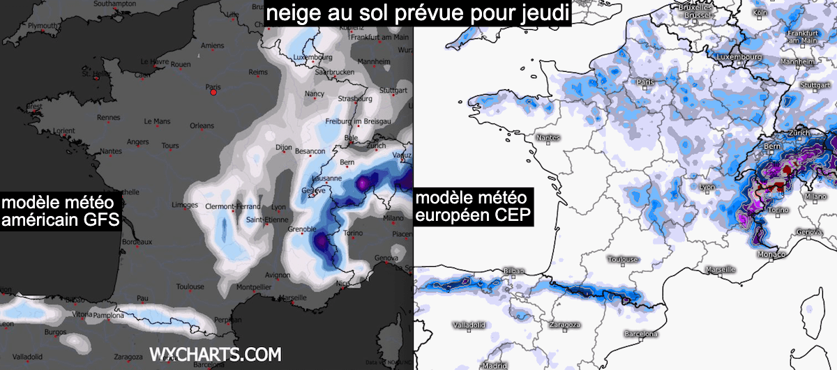 Épaisseurs de neige prévues au sol dans la journée de jeudi, selon le modèle météo américain (à gauche) et le modèle météo européen (à droite).