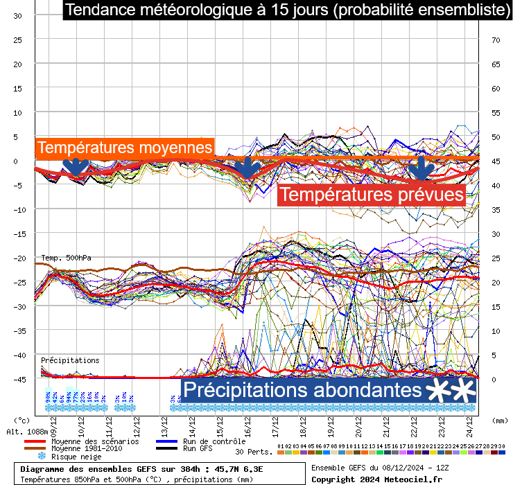 A 15j, la courbe moyenne des températures prévues (rouge) est toujours inférieure ou proche de la moyenne saisonnière (marron) avec le retour de précipitations abondantes, donc sous forme de neige en montagne - GEFS PE Meteociel
