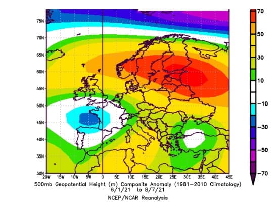 Anomalie de géopotentiel du 1er juin au 7 août 2021 - via NCEP / NOAA