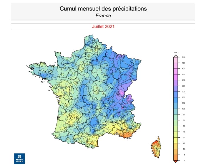 Carte des cumuls de précipitations au mois de juillet 2021 en France - via Météo France