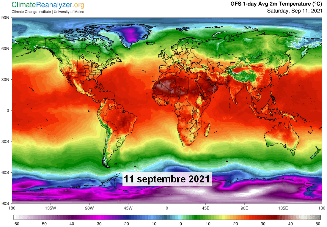 Températures à 2m à l'échelle du globe ce 11 septembre 2021 et le 14 juillet 2021– climatereanalyzer