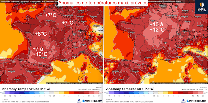 Anomalies de températures maximales prévues mardi et mercredi