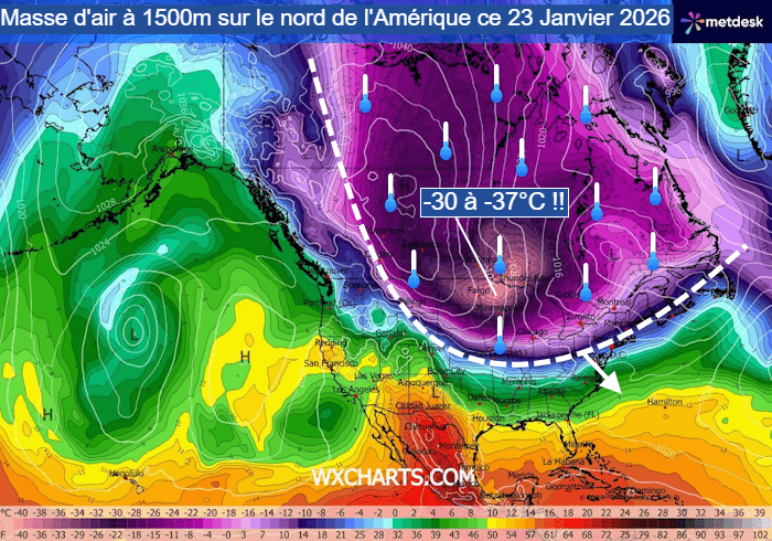 Le décrochage polaire qui intéresse le nord de l'Amérique est massif ! Une nouvelle vague de froid majeure débute de l'autre côté de l'Atlantique et cet air glacial est en train de gagner les États-Unis. Ce vendredi 23 janvier 2026, la température de la masse d'air à 850 hPa (vers 1500m) atteignait -37°C au dessus du Minnesota, des niveaux particulièrement bas et que l'on rencontre plutôt près du pôle ! Au sol, la barre des -30°C est d'ores et déjà franchie dans les États du nord des USA et les ressentis au vent sont encore plus glaciaux !