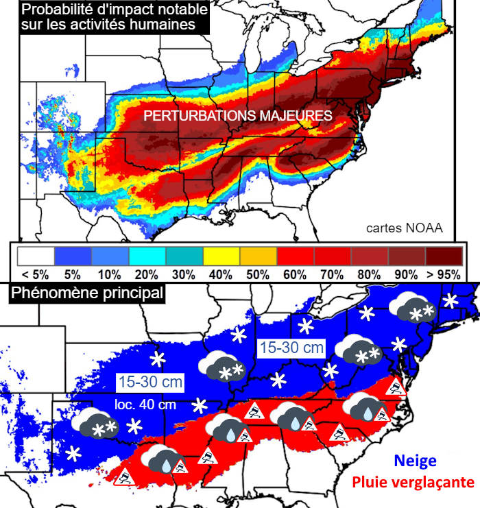 Zones concernées par la neige et le verglas aux USA et probabilité d'impact sur les activités humaines - NOAA