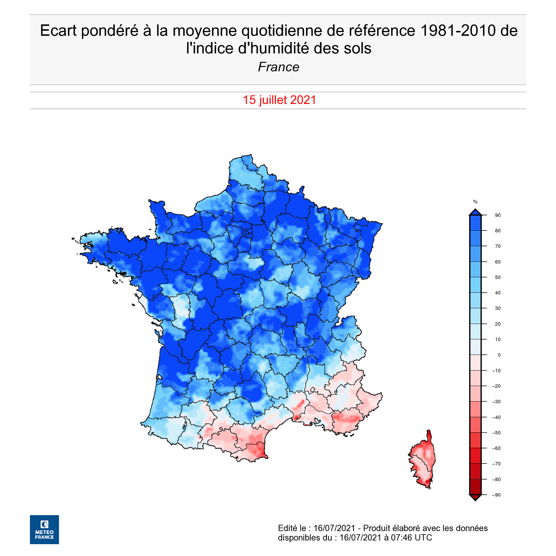 Indice d'humidité des sols en France du 16 juin au 15 juillet 2021 - Météo-France via Gaetan Heymes