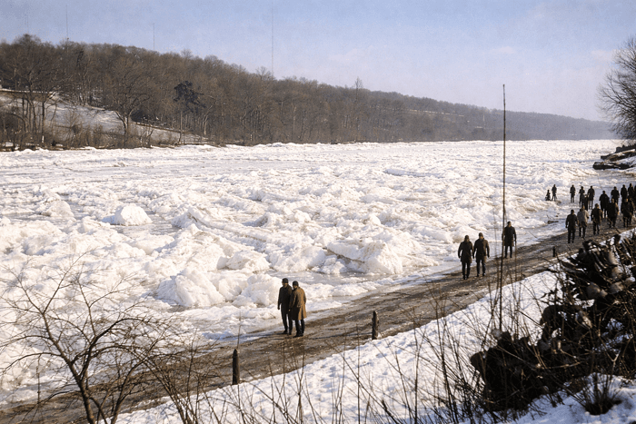 La Seine totalement gelée près de Melun (77) durant la vague de froid février 1956Chronique Météo Villes