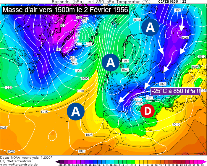 La vague de froid de février 1956 est une véritable référence ! Il s'agit tout simplement de la plus importante en France au cours du XXème siècle. Et pour cause, cette vague de froid a été apportée par un "Moscou-Paris" particulièrement bien établi et qui a dominé la quasi-totalité du mois ! La masse d'air qui touchait la France venait directement de Russie avec un froid d'ampleur remarquable. Dans le sud de l'Allemagne et l'est de la France, la masse d'air atteignait -25°C à 850 hPa (vers 1500m), des niveaux rarissimes au dessus de l'hexagone !