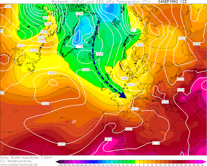 Température à 1500 mètres le 4 septembre 1992 - wetterzentrale.de