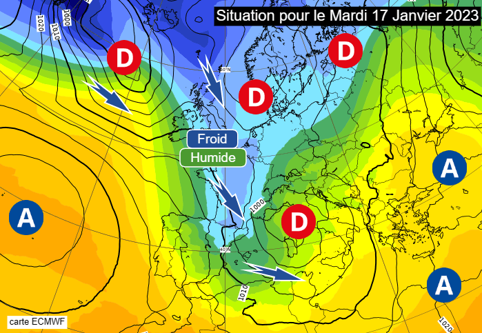 Situation à échelle continentale pour le mardi 17 janvier 2023 - modèle européen via ECMWF