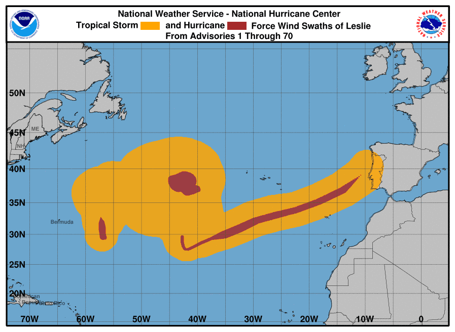 Le cas le plus remarquable est toutefois celui de Leslie, en octobre 2018. Même si l'ouragan n'avait jamais dépassé la catégorie 1, il avait eu une longue vie de plus de trois semaines sur l'Atlantique. Si Leslie fut aussi exceptionnel, c'est parce que l'ouragan avait conservé son statut jusqu'aux portes de l'Europe ! Malgré son déplacement au dessus d'eaux à 20°C, Leslie n'avait perdu son statut d'ouragan qu'à 135 km au sud-ouest de Porto ! Jamais un ouragan ne s'était autant rapproché des côtes européennes ! Leslie était encore une forte tempête au moment de toucher le Portugal. On avait relevé jusqu'à 176 km/h sur la côte en soirée du 13 octobre 2018 ! 300.000 foyers avaient été privés d'électricité et le bilan fut d'un mort et 28 blessés.