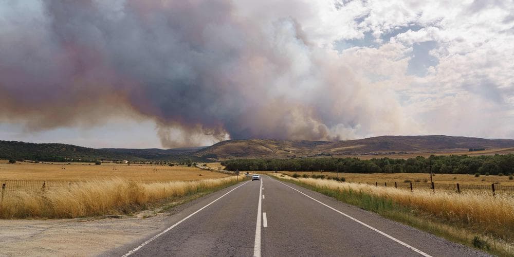 Sous cette chaleur et ce temps sec, et de façon similaire au Sud-Est de la France, des incendies parfois importants se sont déclenchés sur la péninsule ibérique. En fin de semaine du 9 au 15 août, un gigantesque incendie de forêt s'est déclenché sur le Centre-Ouest de l'Espagne, mobilisant plus de 1000 pompiers et dévastant 12 000 hectares de végétation. Plus de 1000 personnes ont dû quitter leur domicile à la suite de ce feu.