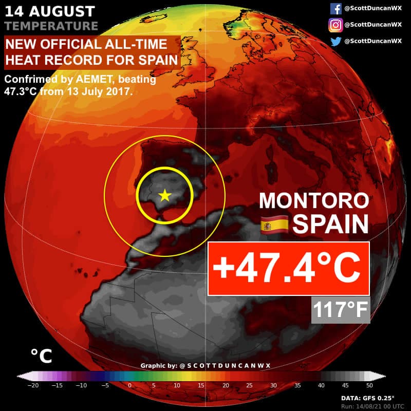 Nouveau record national de chaleur en Espagne le 14 août 2021 – via Twitter : @ScottDuncanWX