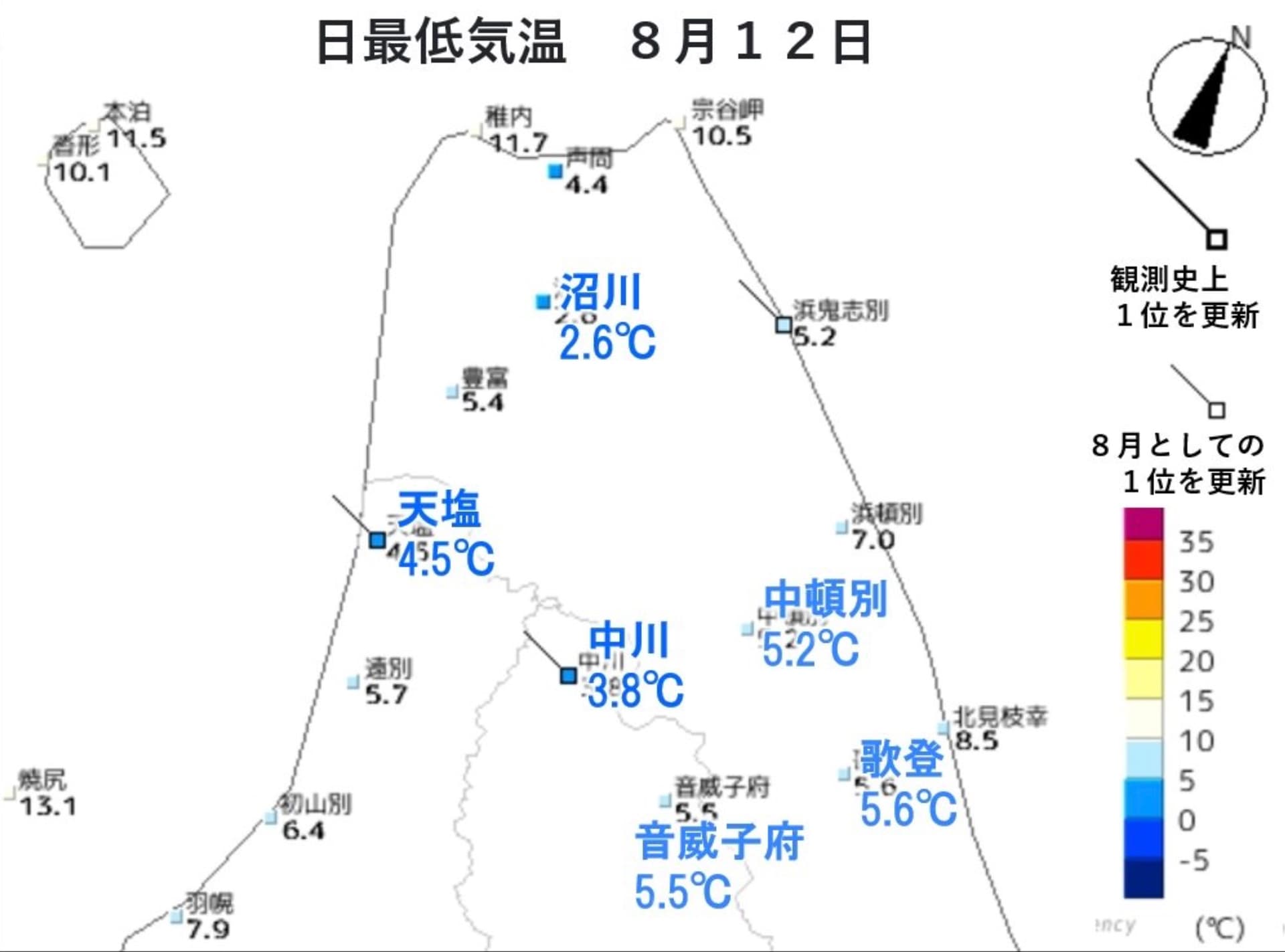 Dans le même temps, la chaleur exceptionnelle de ces dernières semaines a laissé place à un coup de frais marqué sur Hokkaido. Le 12 août, une température minimale de 2,6°C a été relevée à Numakawa, à seulement 1,1°C du record national d'août. Quelques jours auparavant, des records de chaleurs étaient encore battus pour un mois d'août sur cette région.