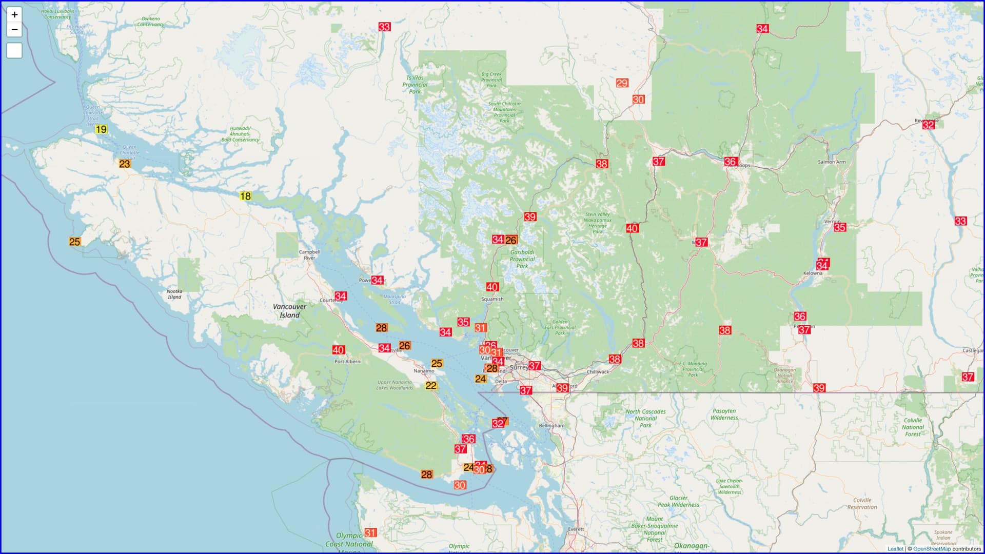 La chaleur et les incendies persistent sur le Nord-Ouest des États-Unis et l'Ouest du Canada. Le 12 août, l'île de Vancouver a établi un nouveau record pour un mois d'août avec jusqu'à 40,2°C à Squamish et 39,8°C à Port Alberni.