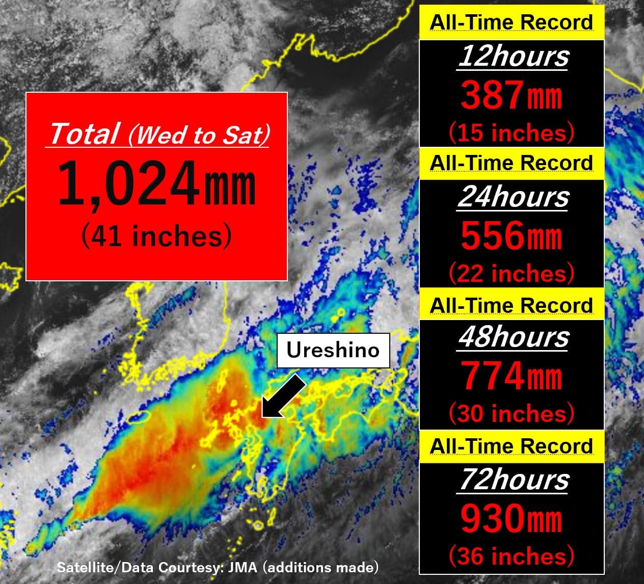 Cumuls de précipitations à Ureshino à la mi-août 2021 – JMA