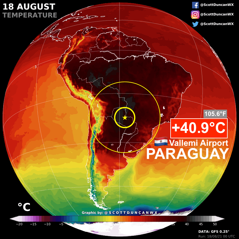 Record de chaleur au Paraguay ce 18 août 2021 – Via Twitter @ScottDuncanWX