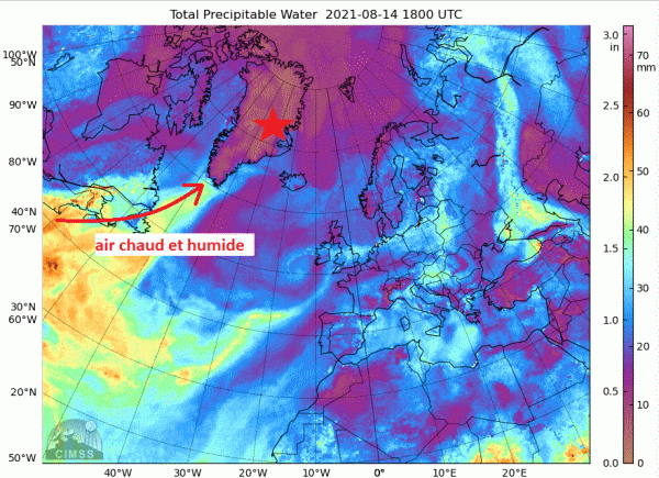 Un phénomène majeur a été observé le 14 août dernier à Summit au Groenland. Cette station, située à 3216m d'altitude à 72°N a en effet enregistré une température supérieure à 0°C durant plus de 9h en raison d'un flux de Sud-Ouest apportant de l'air particulièrement doux et humide en altitude.