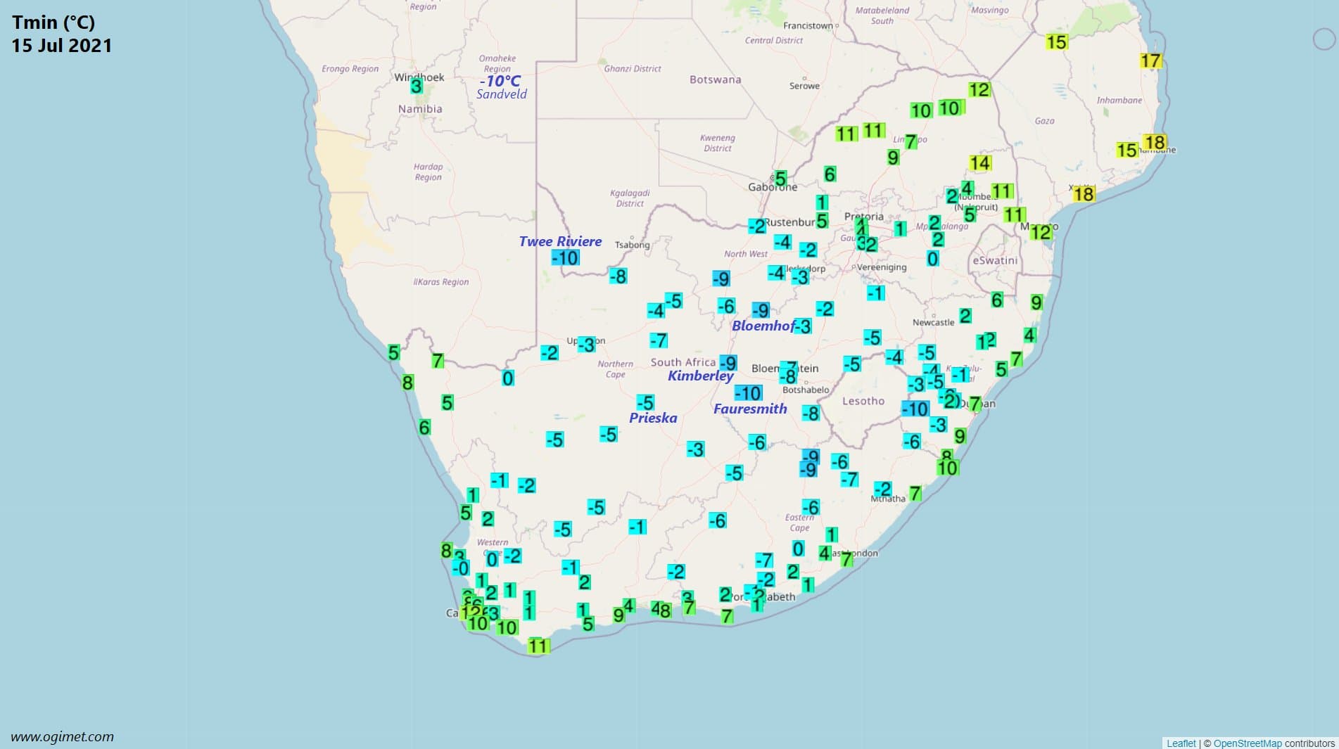 Températures minimales relevées sur le Sud de l'Afrique ce 15 juillet 2021 – OGIMET