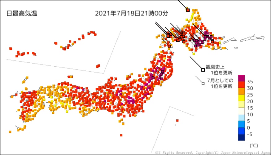 Températures maximales relevées au Japon le 18 juillet 2021 – JMA