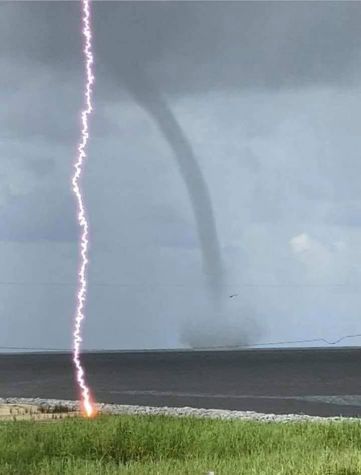 Dans le Golfe du Mexique, c'est une impressionnante scène qui s'est présentée aux yeux des habitants de Dauphin Island en Alabama avec la formation d'une imposante trombe marine en bordure d'un orage. Un photographe a pu immortaliser une scène peu commune d'un coup de foudre très proche frappant la plage avec la trombe marine évoluant en arrière-plan.
