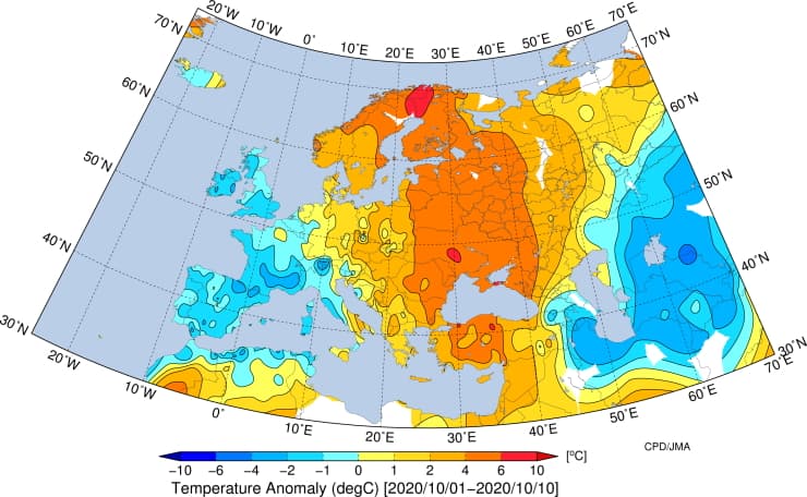 Anomalies thermiques en Europe au cours de la première décade d'octobre 2020 - via JMA