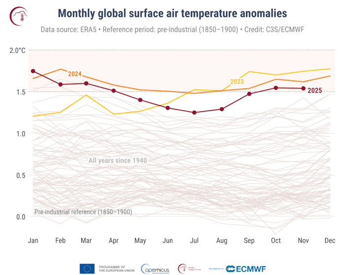 Sur la période allant de janvier à novembre 2025, l'anomalie thermique sur Terre atteint +1,48°C par rapport à l'ère pré-industrielle (1850-1900) ! Ce chiffre est très proche de l'objectif des accords de Paris sur le climat, adopté fin 2015, qui visaient à limiter le réchauffement à +1,5°C. Cette anomalie est semblable à celle enregistrée durant l'année 2023 mais reste derrière celle de 2024, qui était devenue la première année à dépasser la barre symbolique des +1,5°C avec une anomalie mondiale sur 12 mois de +1,55°C.