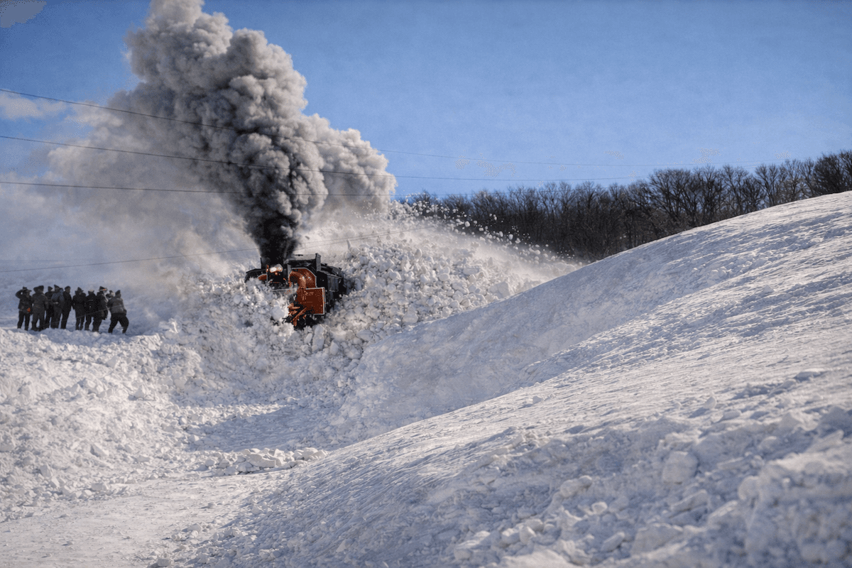 Fin janvier 1914, une partie de l'Aude est paralysé sous 1 m de neige ! À Puichéric, près de Carcassonne, la neige a presque englouti la voie ferrée. Deux locomotives à chasse-neige travaillent sans relâche pour dégager la neige. Leurs efforts font s’émietter le bloc de neige, mêlant fumée et poussière blanche emportée par le vent. Collection meteo-paris.com