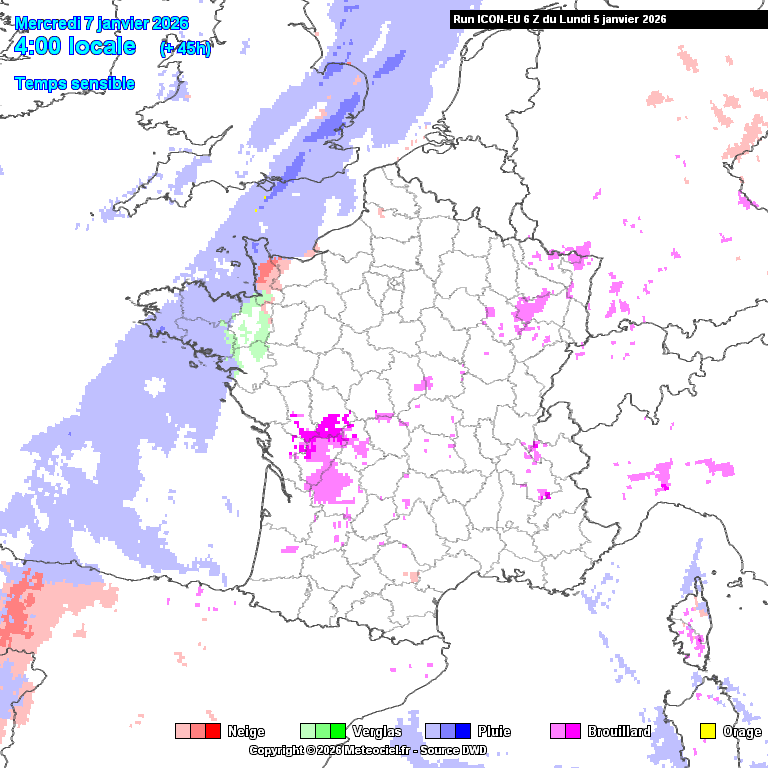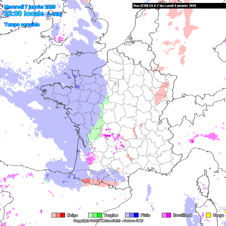 Animation du risque de neige sur la France pour la journée du mercredi 7 janvier 2026 – Modèle ICON-EU via meteociel.fr