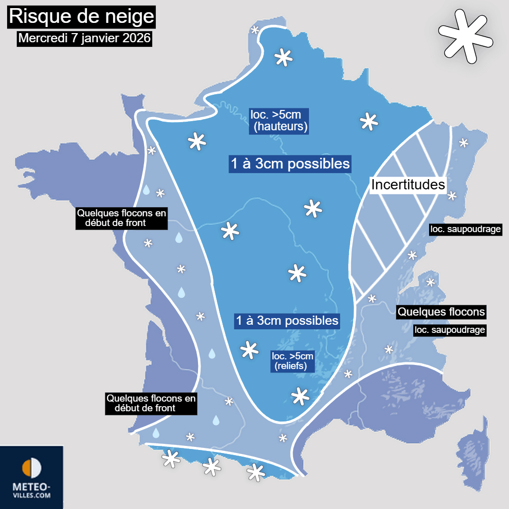 Cumuls de neige envisagés pour la journée du mercredi 7 janvier 2026 – Météo-Villes
