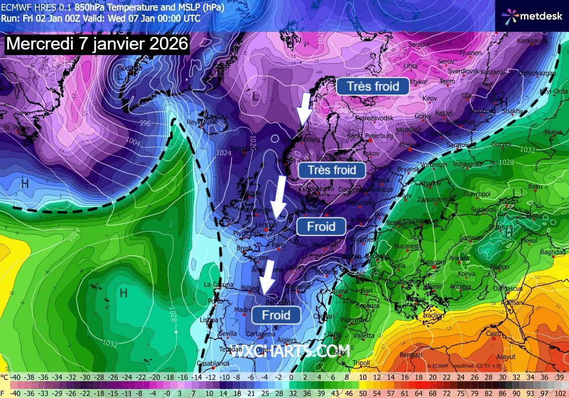 Cette année 2026 débute sous le signe de l'hiver et du froid en France. En effet, notre pays va rester durant plusieurs jours sous une influence polaire maritime avec un flux de nord/nord-ouest apportant une masse d'air très froide venue directement du Pôle Nord, et ce au moins jusqu'en milieu de semaine prochaine.