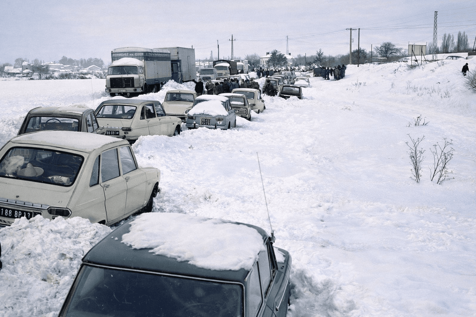 Le 29 décembre 1970, la pire tempête de neige depuis 1917 paralyse le nord des régions Méditerranéennes.  Alors que la neige recouvre déjà toute la moyenne vallée du Rhône, l’autoroute du soleil reste ouverte, piégeant 6000 voitures sur 53 km.  On frôle la catastrophe et on réalise vite que cette portion d’autoroute, ouverte depuis seulement 4 ans, manque cruellement d’un plan de secours pour une telle situation.