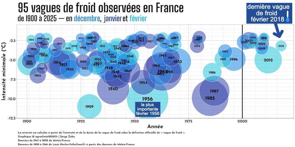 Sur les 95 vagues de froid observées en France depuis 1900, seule une vague de froid a été observée après 2015 et aucune depuis 2020… La dernière, date donc de février 2018... Source : Serge Saka