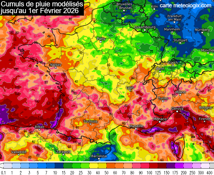 Modélisation des cumuls de pluie du vendredi 23 janvier au dimanche 1er février 2026 - meteologix.com