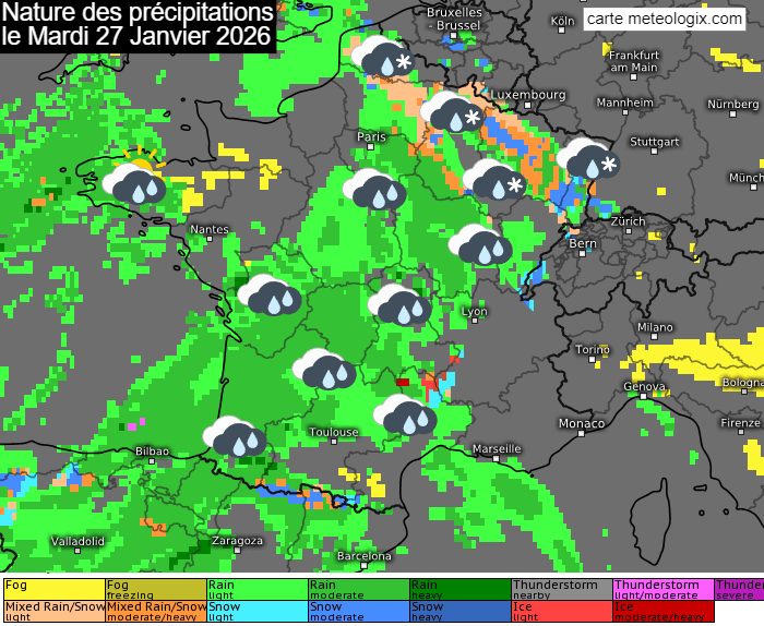 Nature des précipitations (vert = pluie, orange = pluie/neige, bleu = neige) le mardi 27 janvier 2026 - meteologix.com