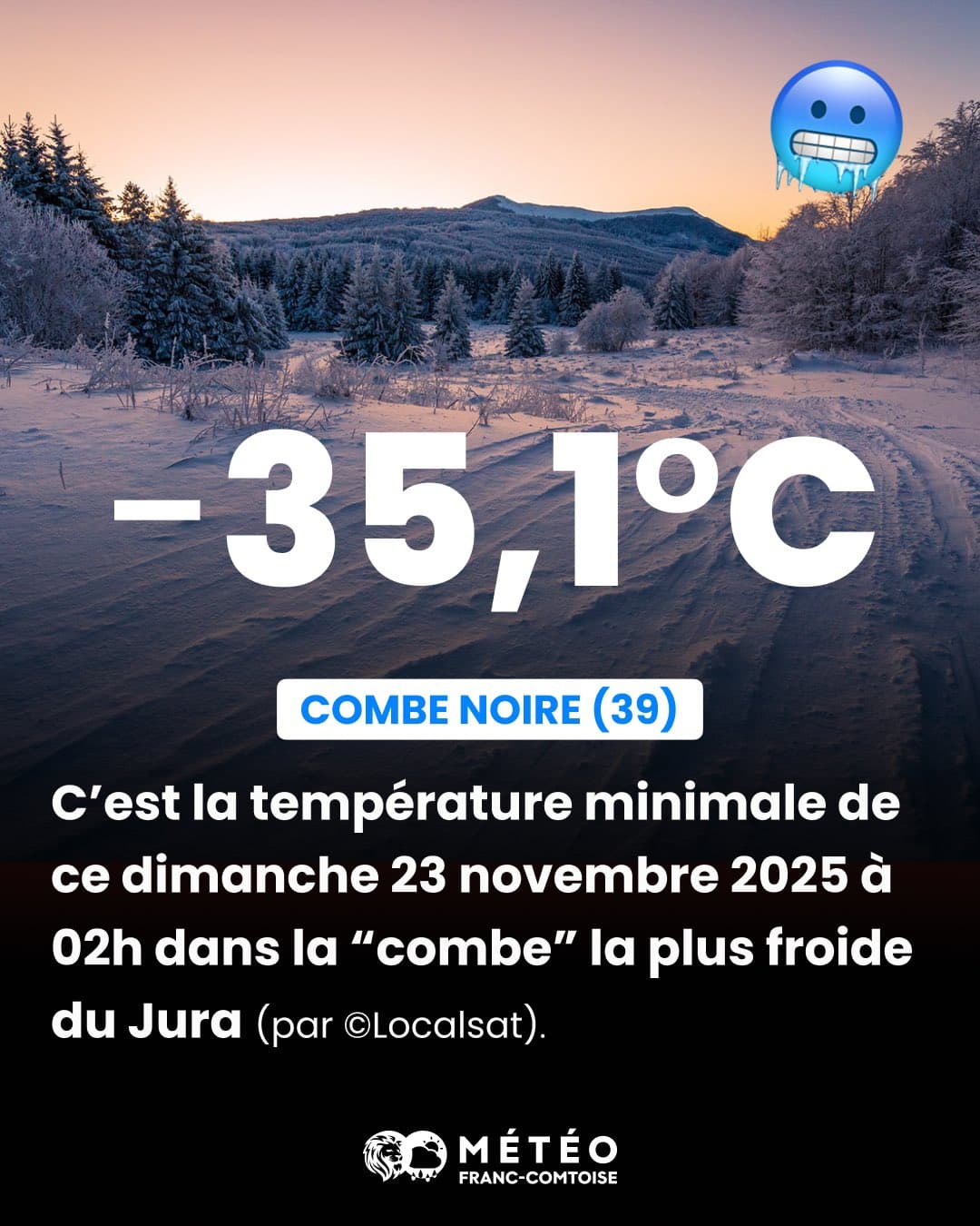 Jusqu'à -35,1°C à la Combe Noire dans le Jura le 23 novembre au matin ! - Via Météo-Franc Comtoise