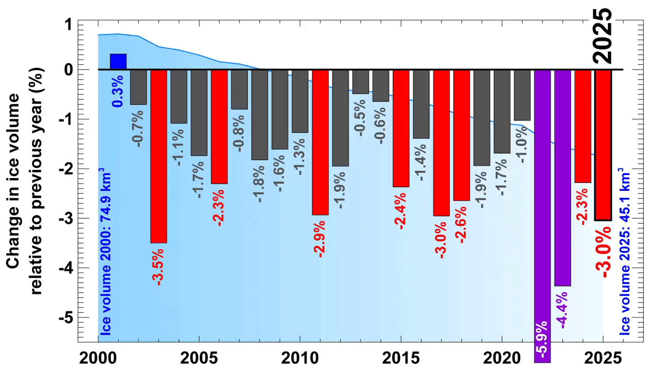 Changement du volume des glaciers suisses par an (en %) de 2000 à 2025 - via Matthias Huss
